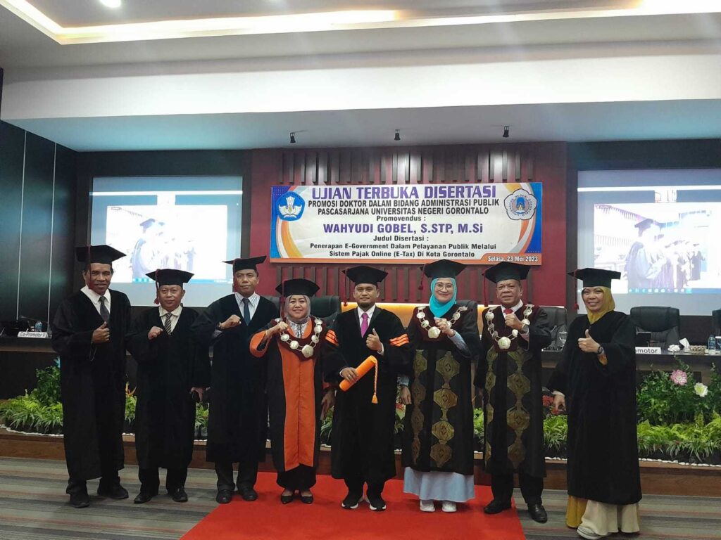 Sebagai alumni ke-39 dalam program doktor administrasi publik, Wahyudi Gobel berhasil mempertahankan disertasinya dengan judul Penerapan E-Government dalam Pelayanan Publik melalui Sistem Pajak Online (E-Tax) di Kota Gorontalo di depan sembilan Penguji yakni, tiga enam bergelar Doktor, Drs. Andi Fefta Wijaya (Penguji Eksternal), Dr. Udin Hamim (Penguji Internal II), Dr. Yanti Aneta (Kaprodi), Dr. Ismet Susila (Co-Promotr II), Dr. Zuchri Abdussamad (Co-Promotor I), Dr. Yuniarti Koniyo (Ketua Sidang, dan tiga bergelar Profesor, Prof. Rauf A. Hatu (Promotor), Prof. Hasim (Wakil Direktur I), dan Prof. Asna Aneta (Direktur/Penguji Internal I).Â