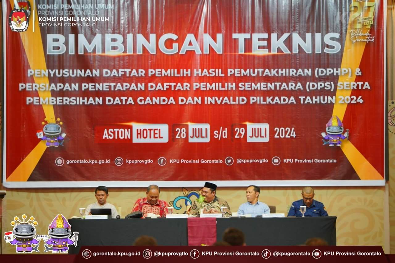 PROSESNEWS.ID – KPU Provinsi Gorontalo mengadakan Bimbingan Teknis (Bimtek) terkait Penyusunan Daftar Pemilih Hasil Perbaikan (DPHP) dan Persiapan Penetapan Daftar Pemilih Sementara (DPS), serta Pembersihan Data Ganda, pada 28-29 Juli 2024 di Hotel Aston, Kota Gorontalo. Acara ini diselenggarakan dalam rangka mempersiapkan penyelenggaraan Pilkada Tahun 2024.