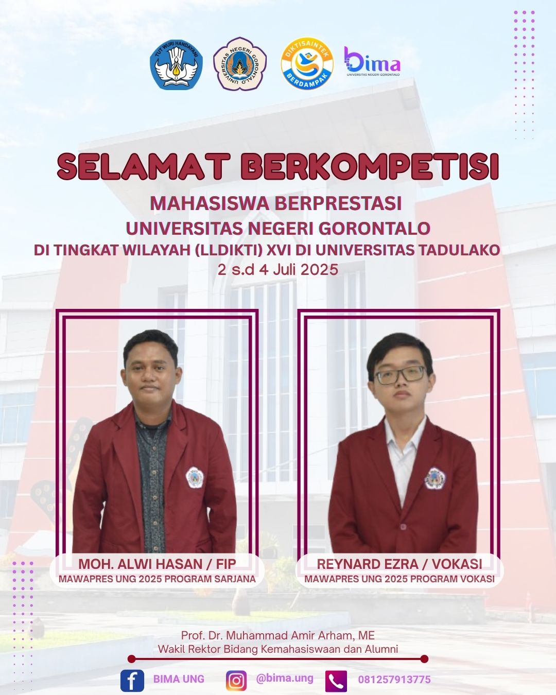 Mereka adalah Mohamad Alwi Hasan, mahasiswa program sarjana dari Fakultas [Nama Fakultas], dan Reynard Ezra, mahasiswa program vokasi. Keduanya terpilih melalui seleksi internal yang dilakukan oleh UNG pada ajang Pilmapres tingkat universitas beberapa waktu lalu.