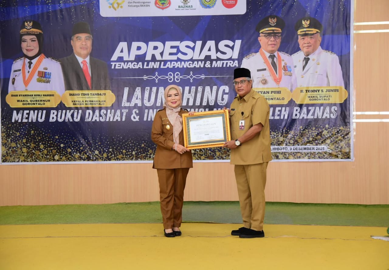 PROSESNEWS.ID – Wakil Gubernur Gorontalo, Idah Syahidah Rusli Habibie, menerima penghargaan sebagai Bunda Akselerasi Penurunan Stunting dari Badan Kependudukan dan Keluarga Berencana Nasional (BKKBN) RI. Penghargaan tersebut diserahkan oleh Kepala BKKBN Provinsi Gorontalo, Diano Tino Tandaju, pada kegiatan peluncuran buku DASHAT (Dapur Sehat Atasi Stunting) di Gedung Dikbud Kabupaten Gorontalo, Selasa (9/12/2025).