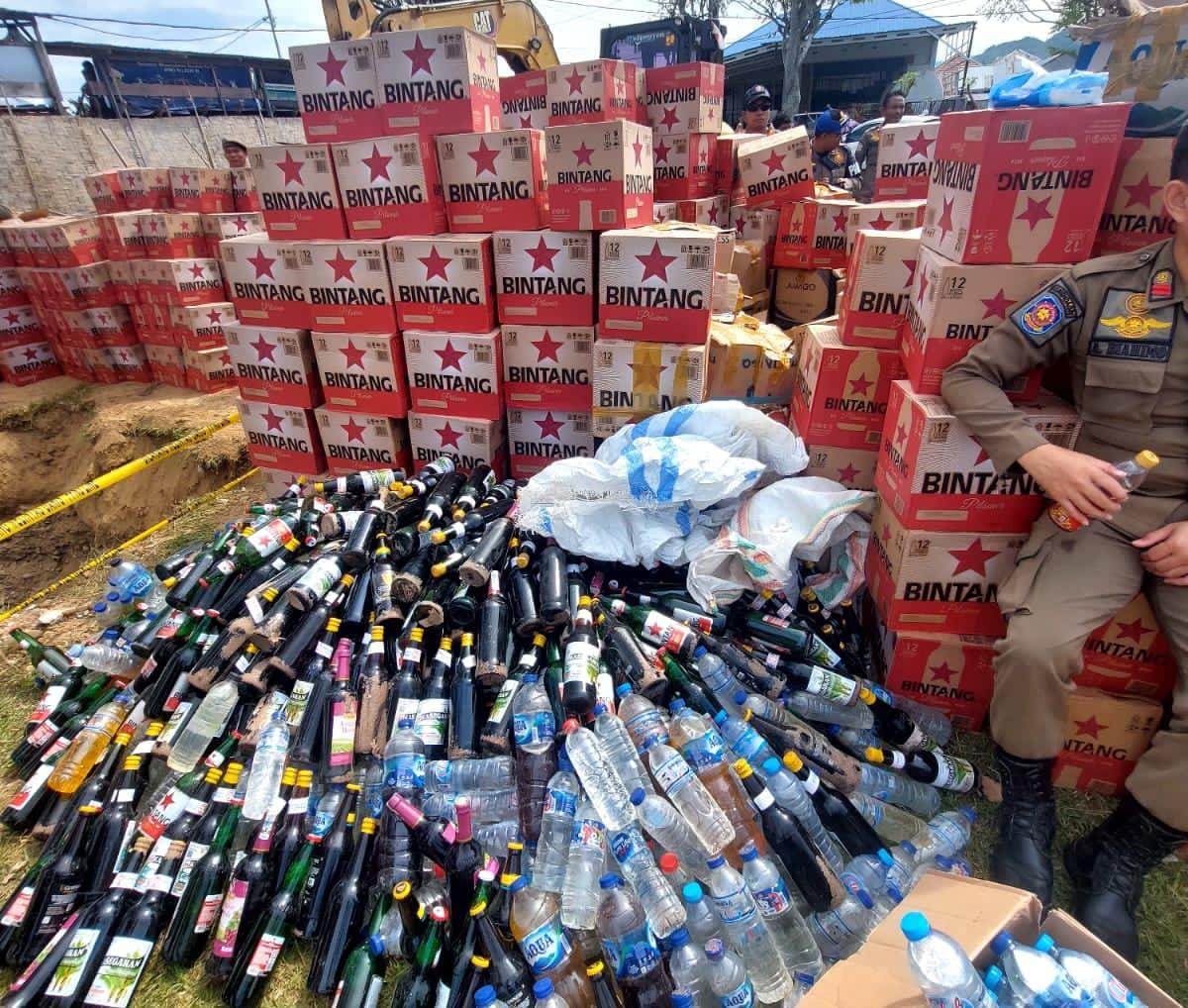 Ribuan botol miras hasil sitaan tersebut dimusnahkan dengan cara digilas menggunakan alat berat di hadapan unsur Forum Koordinasi Pimpinan Daerah (Forkopimda) dan masyarakat.