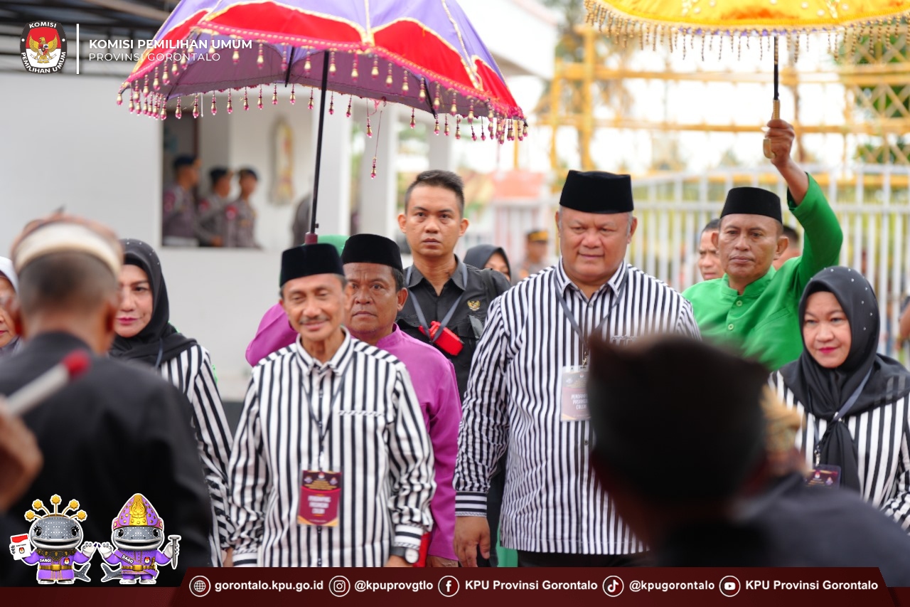 Delegasi Gabungan Partai Politik dan Bakal Pasangan Calon disambut dalam prosesi adat Gorontalo yang dipimpin oleh Drs. Karim T. Laiya dari Lembaga Adat Gorontalo, serta diterima langsung oleh Plt. Ketua KPU Provinsi Gorontalo, Risan Pakaya, bersama Anggota KPU Provinsi Gorontalo, Hendrik Imran, Sophian Rahmola, dan Opan Hamsah. Kegiatan tersebut juga disaksikan oleh Bawaslu Provinsi Gorontalo.