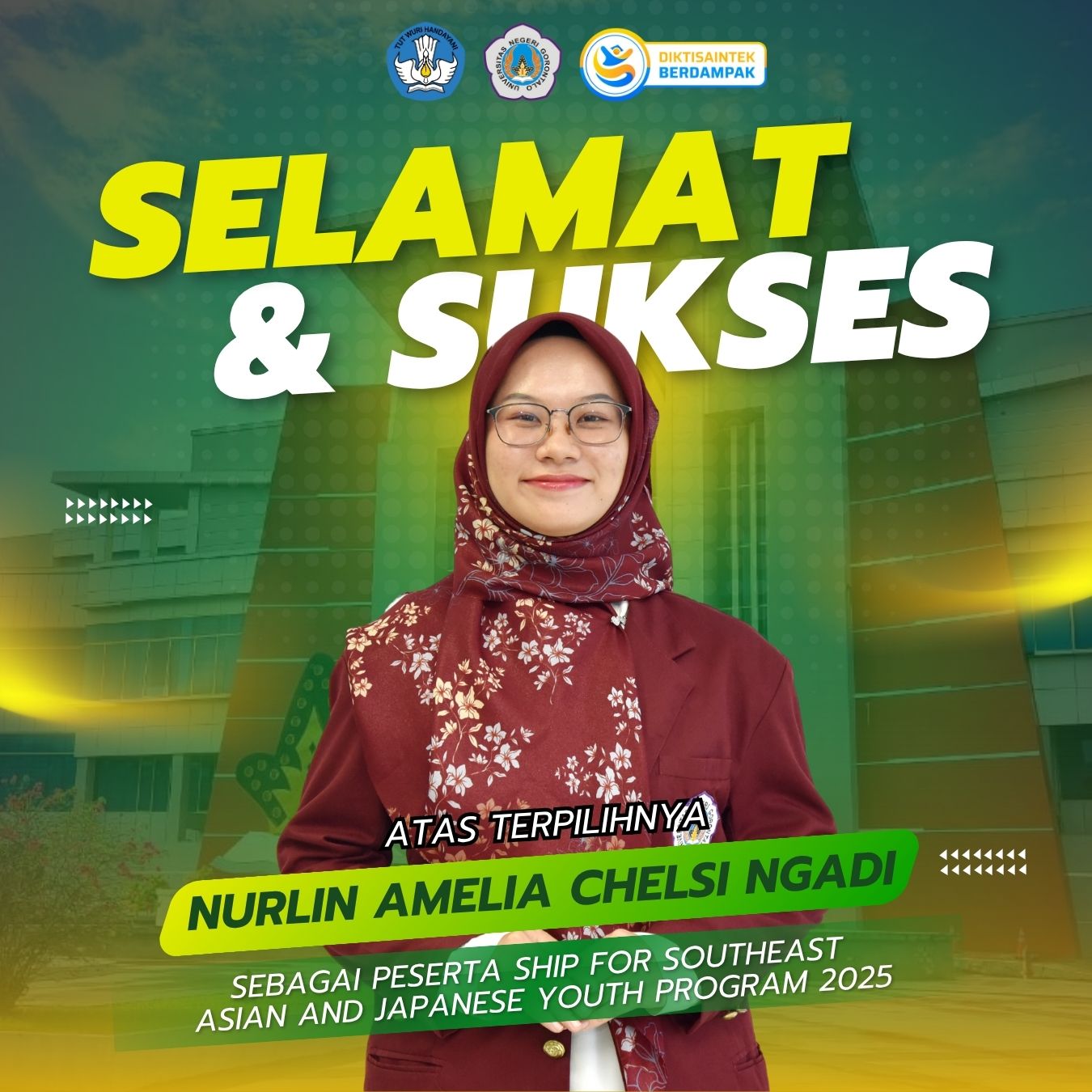 Adalah Nurlin Amelia Chelsi Ngadi, mahasiswa jurusan Pendidikan Bahasa Inggris, yang akan mengikuti Ship for Southeast Asian and Japanese Youth Program (SSEAYP) tahun 2025. SSEAYP merupakan program pertukaran pemuda tahunan yang digagas oleh Pemerintah Jepang bekerja sama dengan negara-negara ASEAN.