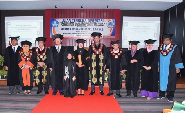 PROSESNEWS.ID, Pendidikan – Program doktor administrasi publik pascasarjana Universitas Negeri Gorontalo (UNG), terus konsisten dalam melahirkan lulusan terbaik dengan mengukuhkan lulusan doktor ke-37. Lulusan yang dikukuhkan setelah menyelesaikan perkuliahan hingga ujian terbuka disertasi yakni Kristina Mohamad Udoki.