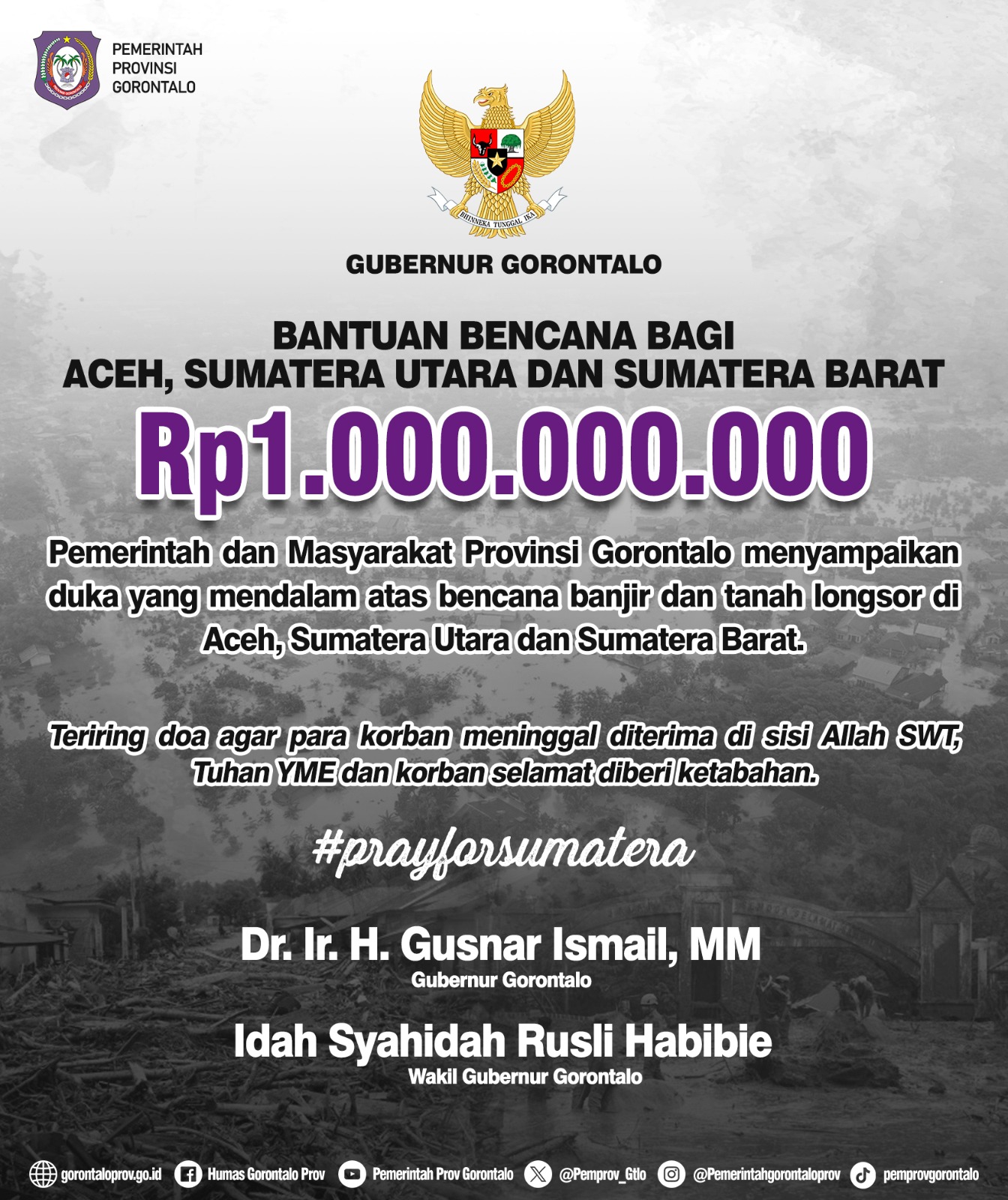 PROSESNEWS.ID – Pemerintah Provinsi Gorontalo menyalurkan bantuan keuangan sebesar Rp1 miliar kepada masyarakat yang terdampak bencana banjir di tiga provinsi, yakni Aceh, Sumatera Barat (Sumbar), dan Sumatera Utara (Sumut).