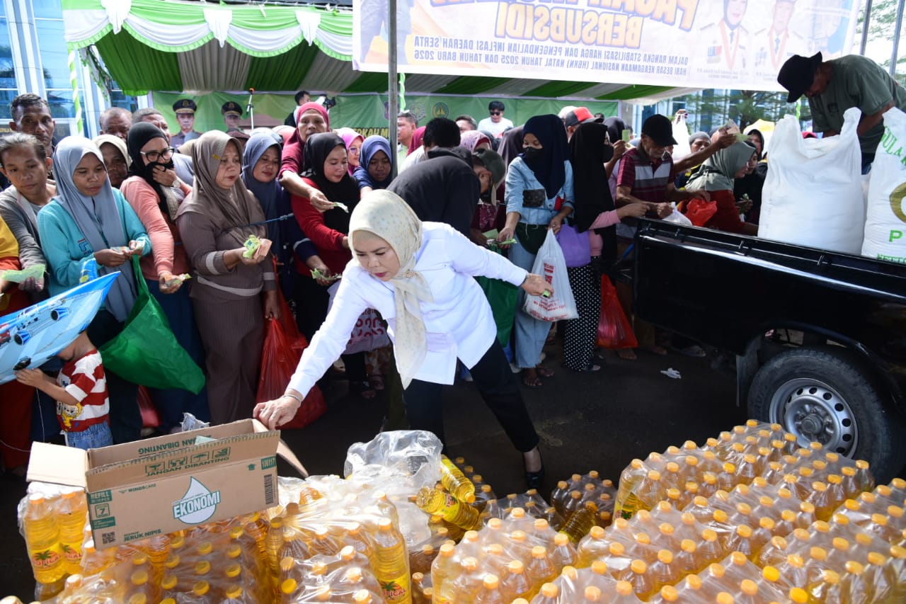 Setelah dibuka secara resmi, Gubernur Gusnar dan Wakil Gubernur Idah Syahidah memantau langsung pelaksanaan pasar murah.