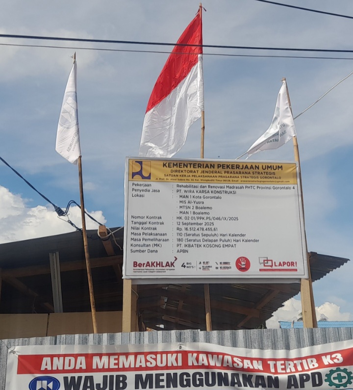 Proyek yang berlokasi di empat titik, MAN 1 Kota Gorontalo, MIS Al-Yusra, MTsN 2 Boalemo, dan MAN 1 Boalemo merupakan program dari Kementerian Pekerjaan Umum dan Perumahan Rakyat (PUPR) melalui Satuan Kerja Pelaksanaan Prasarana Strategis Gorontalo, dengan masa pelaksanaan sejak 12 Oktober 2025.
