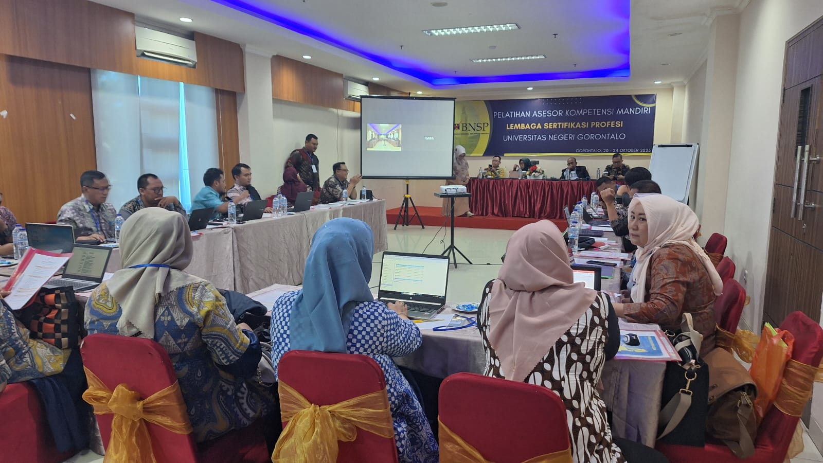 PROSESNEWS.ID — Dalam mendorong peningkatan kompetensi dosen, Universitas Negeri Gorontalo melalui Lembaga Sertifikasi Profesi (LSP) P1 memberikan pelatihan asesor kompetensi mandiri. Bekerjasama dengan Badan Nasional Sertifikasi Profesi (BNSP), UNG memberikan pelatihan yang diikuti 24 dosen dari Fakultas Matematika dan Ilmu Pengetahuan Alam (FMIPA), Sabtu (20/10/23).