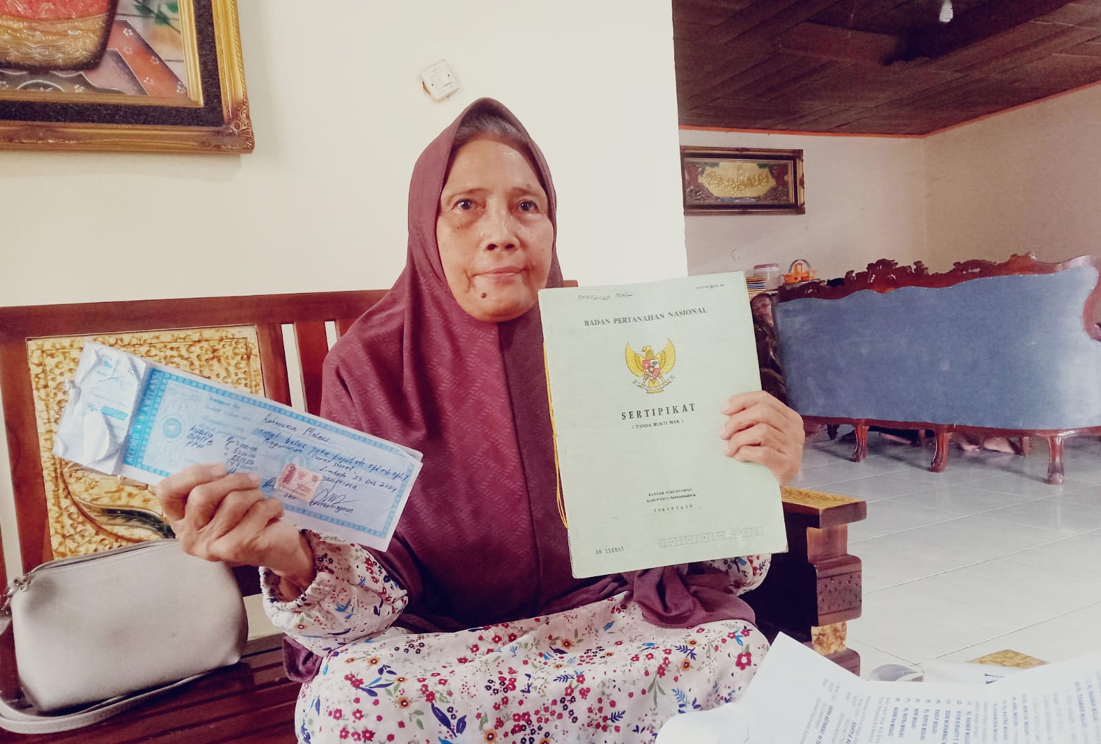 “Saya tanya di BPN, sertifikat cuma dititip di loket pendaftaran. Katanya belum ada uang dari pemilik. Padahal uang sudah dia ambil,” bebernya.