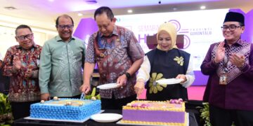Dirjen Pembinaan Vokasi dan Produktivitas Kemenaker, Budi Hartawan (kiri) bersama Wagub Idris Rahim (tengah), melihat hasil praktek mahasiswa di Laboratorium ...