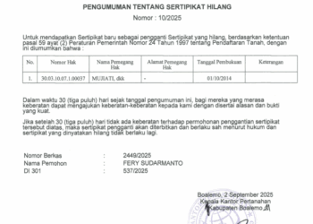 PROSESNEWS.ID – Kantor Pertanahan Kabupaten Boalemo, Kementerian Agraria dan Tata Ruang/Badan Pertanahan Nasional (ATR/BPN), mengumumkan hilangnya sertifikat tanah atas nama ...
